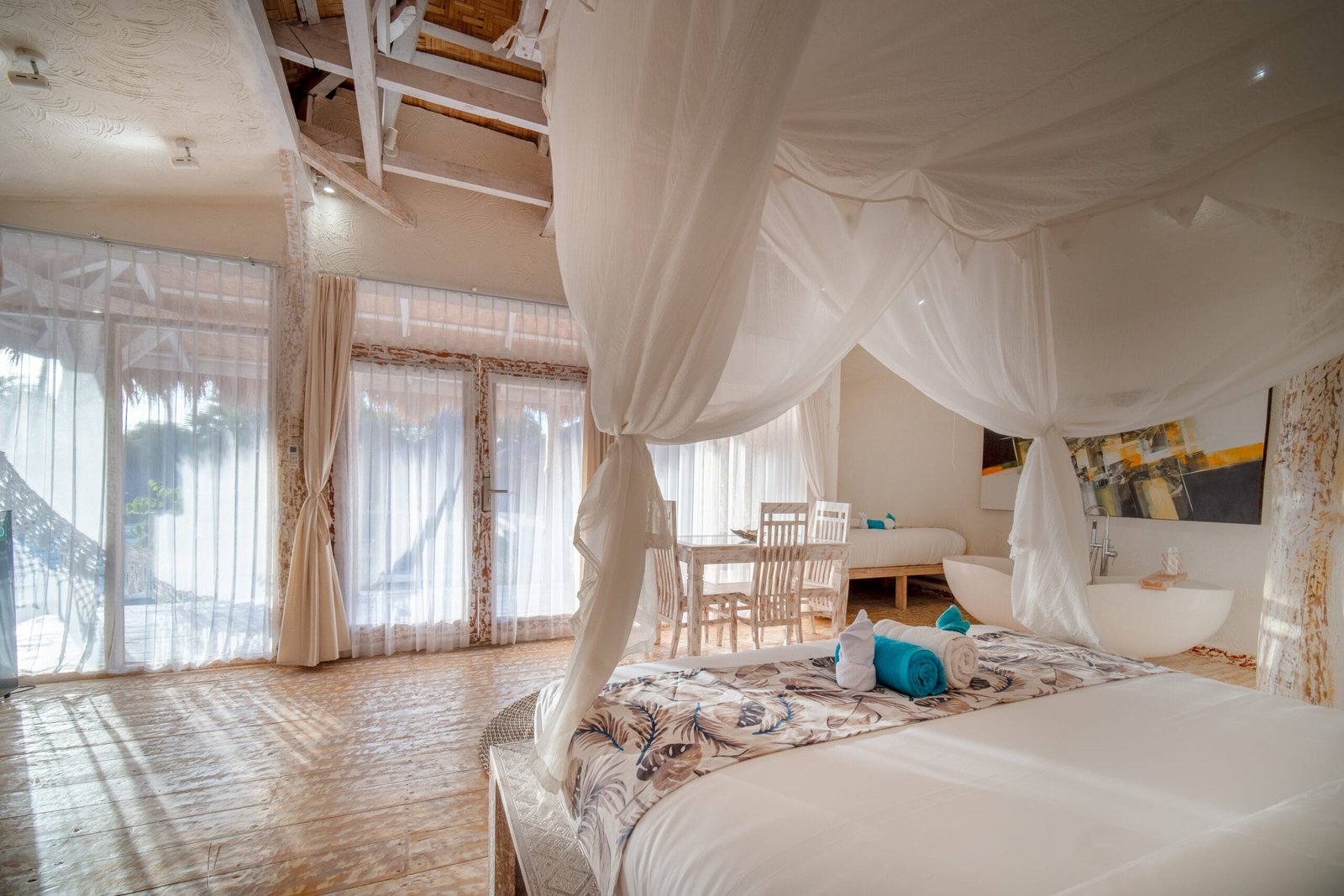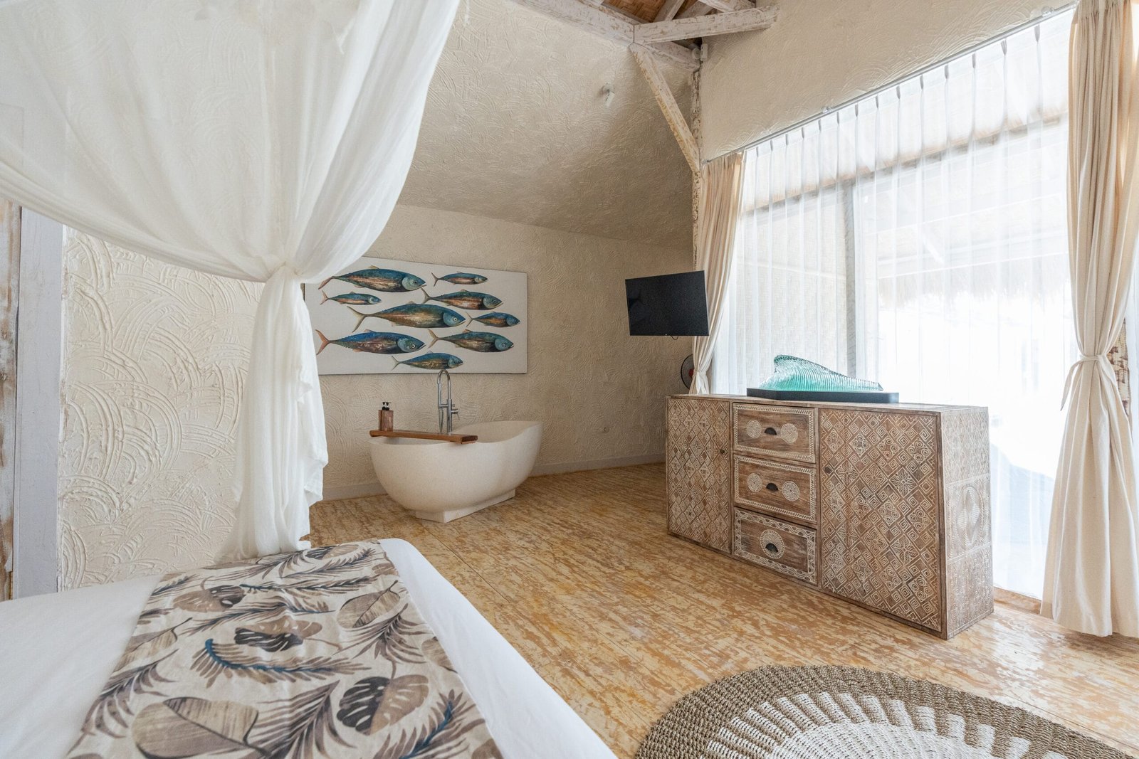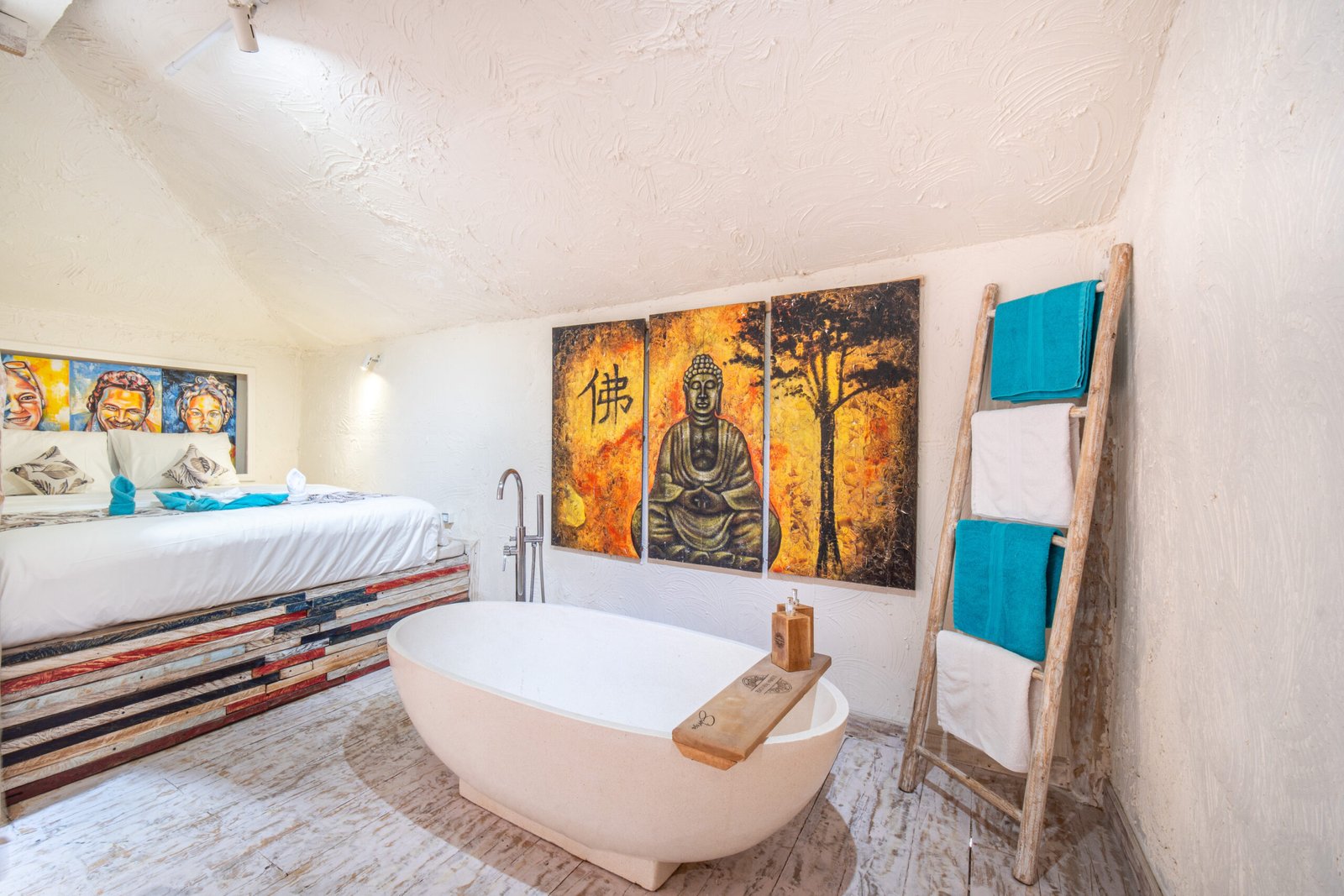 Diverse bungalows with varied decorations and themes—some with showers, others with bathtubs, and some with kitchens.