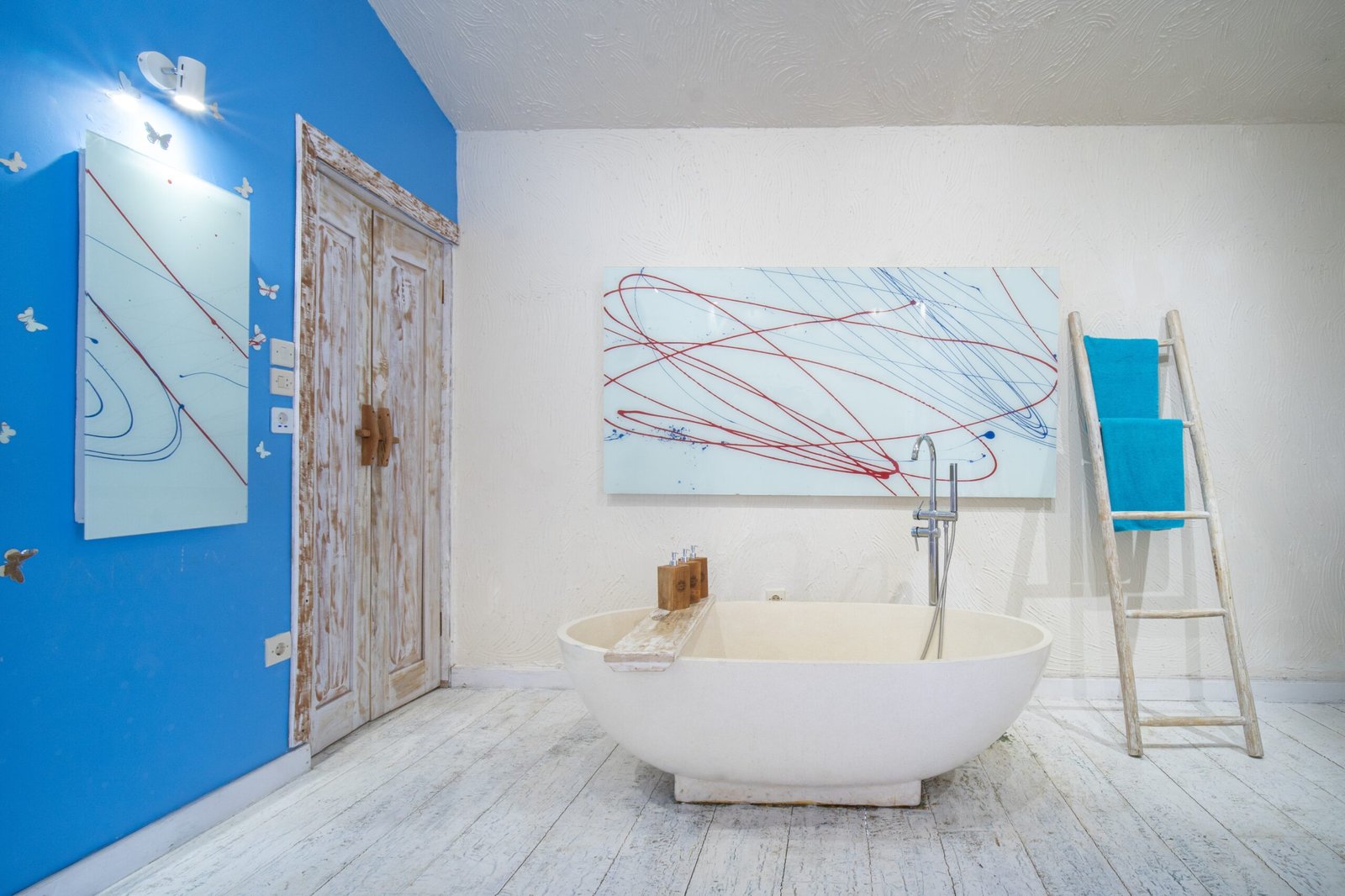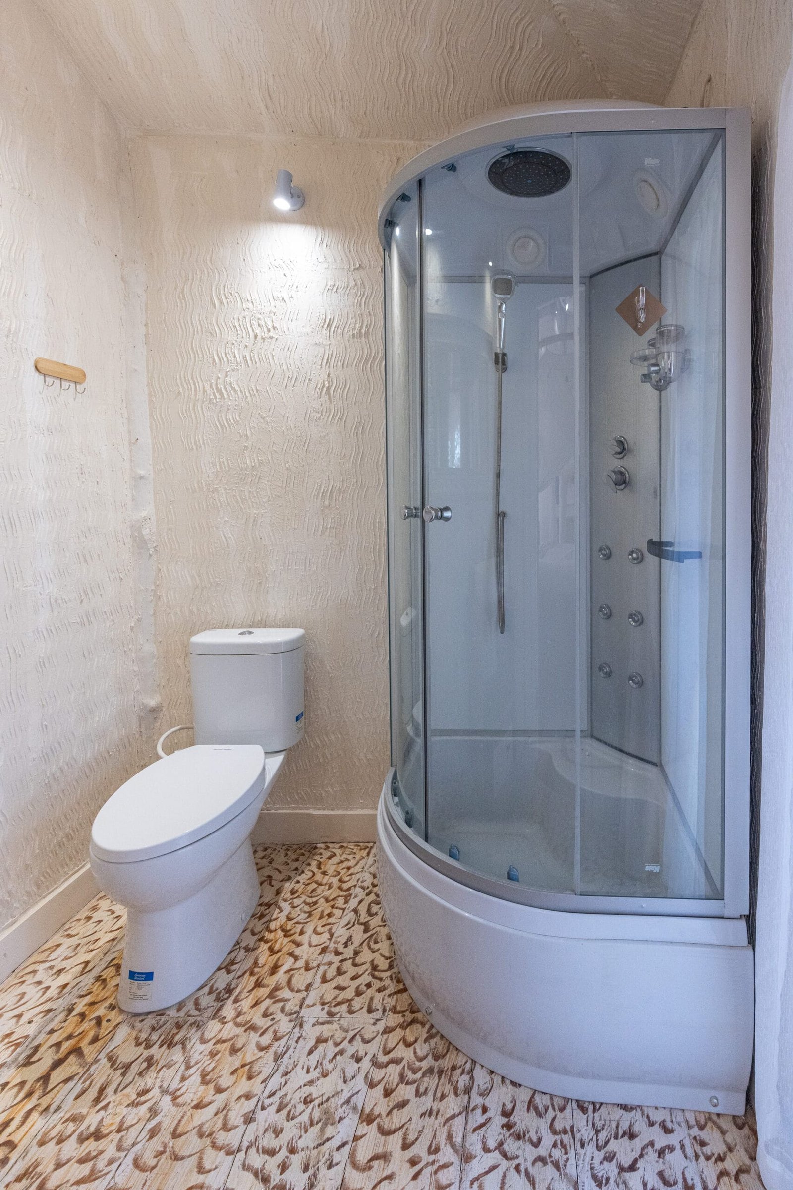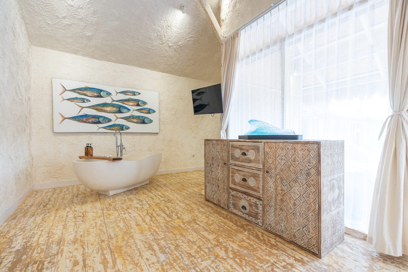 Diverse bungalows with varied decorations and themes—some with showers, others with bathtubs, and some with kitchens.